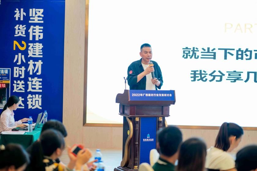 企业代表坚伟建材连锁联合创始人、广西高富强供应链科技有限公司董事长梁鹏先生结合个人在供应链行业多年的经历,做了《建材行业十大痛点及解决方法》的演讲。