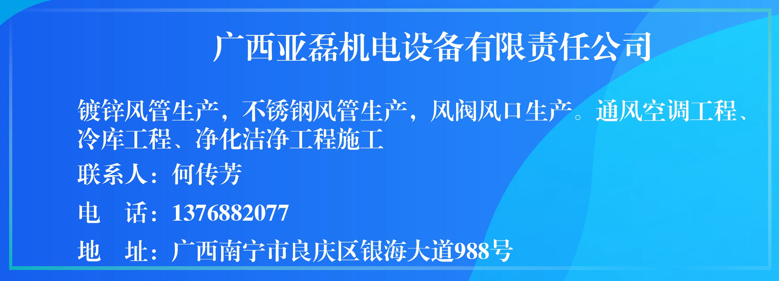 广西亚磊机电设备有限责任公司成立于2018年1月26日,坐落于广西南宁市良庆区银海大道988号,距玉洞高速收费站出口约3.6公里。物流交通十分便利。是一家集加工、销售为一体的综合型企业。专业加工生产镀锌风管、不锈钢风管、风阀、风口、角铁法兰、C型钢、角码、夹码、密封胶条等各类风管配件。配套产品还有橡塑保温材料、保温胶水;各类风机、风口、风阀以及水泵、空调设备等机电设备。本公司生产车间占地面积5000多平方米,拥有国内一流的生产设备,包括全自动风管线、TDF共板式法兰机、卷板机系列、等离子切割机,法兰自动焊机。我们的生产优势:风管日均产量达到6000多平方米,角铁法兰生产更是领先同行,生产效率达到8秒/个。是客户缩短工期、提高施工质量、效率的有力保障。公司以先进的管理理念以及完善的质量保证体系为基础,不断的吸收和引进先进的生产技术,积极推进产品的持续改进和技术创新,确保每一个生产环节都得到严格的控制,致力于亚磊品牌始终处于行业的领先地位。