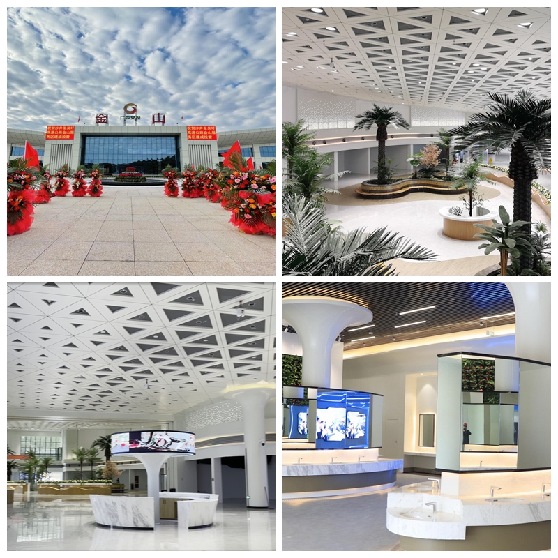 装饰工程的难点、特点:一、室内顶棚铝单板造型复杂,有三角蜂窝型铝单板,需足一拼接安装。有波浪形铝单板,需放点、对线标高调整;二、外墙玻璃幕墙面积大,跨度长,对安装的稳固性产生了更大的困难。三、装饰工程的新工艺、新材料:盥洗区绿植墙墙面采用真实植物满步墙体上,在内增加喷雾系统进行自动淋水,达到长期正常生长、净化绿化。